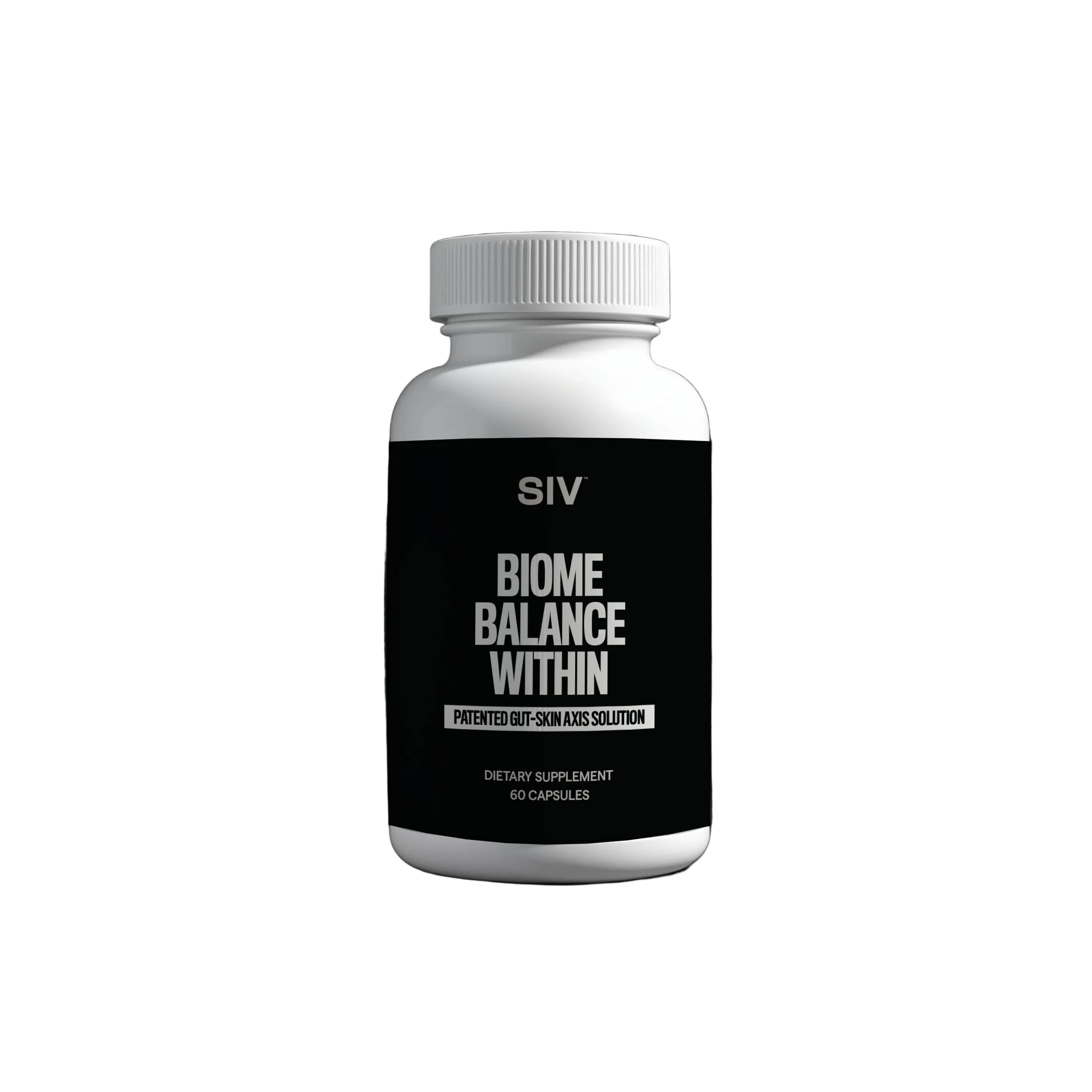 A probiotic-powered skincare supplement designed to support the gut-skin axis and overall skin microbiome. SIV Biome Balance Within is formulated with a powerhouse combination of spore-based probiotics, antioxidant carotenoids, citrus polyphenols, and vitamin K2 that target the gut-skin axis for visible change in your skin’s tone, texture, and resilience. This product supports a hydrated, firm complexion, promotes resilience to UV and environmental stressors, and helps smooth non-cystic acne blemishes for lasting clarity.